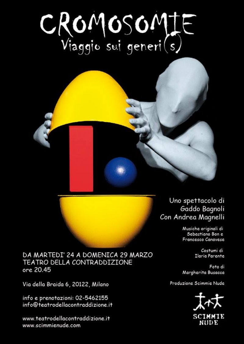 Il monologo di Scimmie Nude, al Teatro della Contraddizione fino al 29 marzo, alterna astrazione poetica, teatro danza e ammiccamenti “da Vizietto” sulla definizione dei generi maschile/femminile. "Trovo che qui dentro tutto sia così… provvisorio" (R. W. Fassbinder, Come gocce su pietre roventi) [yjsgimgs image=”images/stories/images_old_articles/thumbs/articles10_cromosomie1.jpg” class=”radiusb5 yjsg-lightbox-items” title=”articles10_cromosomie1.jpg” link=”images/stories/images_old_articles/stories/articles10/cromosomie1.jpg” target=”” effect=”tilt”] L’attore si contorce icasticamente…