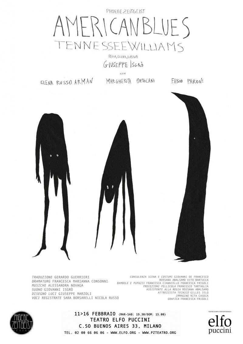 All’Elfo Puccini Phoebe Zeitgeist mette in scena American Blues, tre atti unici di Tennessee Williams diretti da Giuseppe Isgrò: il melodramma della Grande Depressione (o dell’oggi?) stravolto in chiave iperrealista. I personaggi e, ancora più spesso, le protagoniste di Tennesee Williams, sono individui costretti a "compensare alle crudeli deficienze della realtà con l’esercizio…