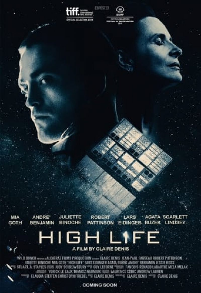 Nel suo ultimo High Life (in apertura e a lato locandine internazionali) lo fa con gli strumenti del genere fantascientifico spaziale, quindi doveroso occuparsene per noi, anche se la distribuzione italiana l’ha colpevolmente ignorato ed è stato possibile vederlo solo domenica 9 al coraggioso festival milanese Oltre lo Specchio in proiezione unica sottotitolata. E nonostante un cast anche di notevole appeal, che schiera un divo come Robert Pattinson nel ruolo del protagonista Monte, Juliette Binoche in quello della dottoressa Dibs, Mia Goth (sotto a sinistra, indimenticabile in Nymphomaniac 2) e persino il rapper André Benjamin (sotto a destra, che però non canta nella colonna sonora, a differenza di Pattinson) in quello di uno degli altri prigionieri del cast.